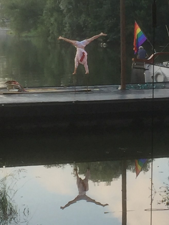 Water, riet, een boot, een ponton. De grillige stadse kade op de achtergrond, regen achterwege. Het water rimpelloos aan de voeten van het publiek. Tot de bol kroos beweegt en er de gids van de voorstelling Durf! onder blijkt te zitten. Hij neemt je mee langs de klanken van de band, de vaardigheden van de artiesten en de lach en traan die een circus, dit circus, zo speciaal maken.