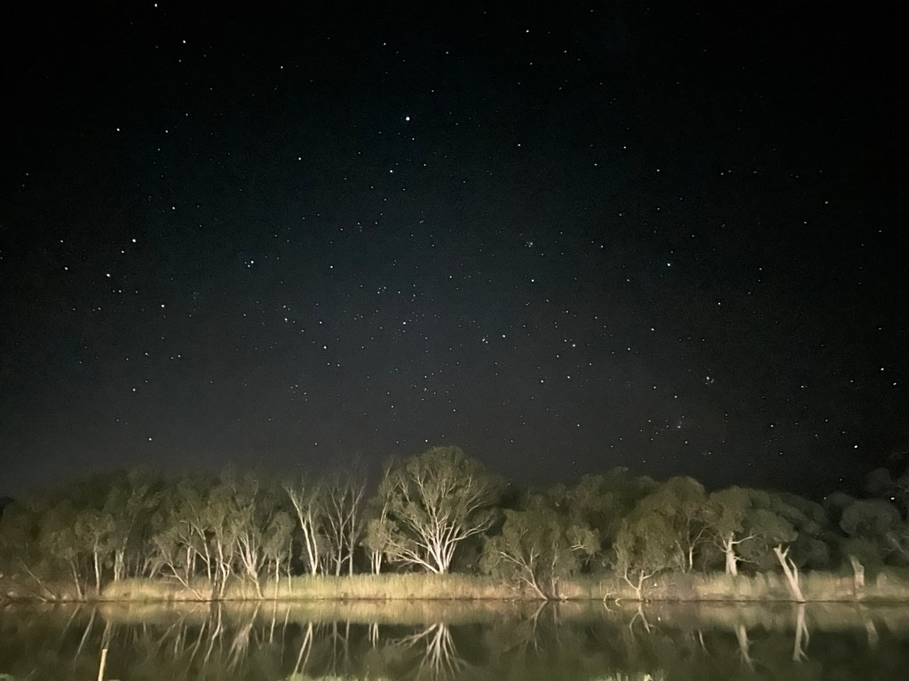 Je realiseert het je niet zo terwijl je reist maar alles aan en in het lijf vertelt je hoe het ervoor staat wanneer je even pauze houdt. Even pauze is in dit geval een verblijf van een dag of twee in een Bed & Breakfast met als belangrijkste item: een goede airconditioning en ruimte om binnen te kunnen zitten. Na alweer een aantal weken in de Outback gewoon in een klein stadje beland waar je niet hoeft na te denken over wind, felle zon, water, stof en hoe dat te bestrijden of juist niet. Het is deze dagen rond de veertig graden alhier en de ervaring leert dat ik dan ophoud met normaal functioneren. Zeg maar gerust dat ik ophoud met functioneren in het geheel. Ik ben er niet voor gemaakt, die hitte. Vandaar de zeer gewaardeerde schuilplaats in een rustig buitenwijkje van MIldura aan de grens tussen New South Wales en Victoria. Er is hier weer water in rivierenvorm( de Murray en de Darling river komen een stukje noordwaarts samen) en de omgeving is groen. Da’s even wennen na een poos stofhappen maar zeker fijn. Zit je ineens een middag en avond buiten in het gras aan de rivier met tig vogels, vissen en miljoenen sterren. Voordat de hitte toeslaat dan. Men is het hier wel gewend alhoewel het wel extreem en vroeg is dit jaar. Overal is de weerkaart lichtelijk anders ingekleurd dat eerder en het is of natter, warmer of droger, het waait meer en harder of juist niet kortom, geen pijl op te trekken. De Aussies verdwijnen gewoon uit het straatbeeld om zich slechts omhult door rijdend blik te vertonen onderweg naar de shopping mall waar de airco staat te loeien. Zeg maar Nederland in een koude winter met veel regen maar dan andersom qua warmte/koude regeling.