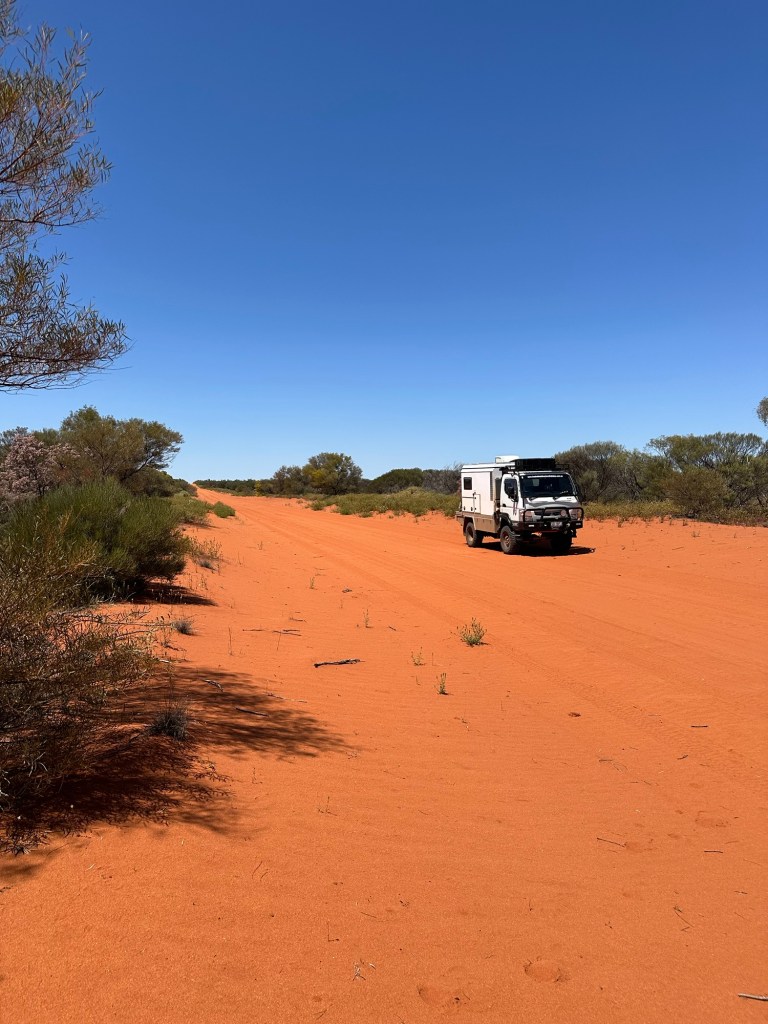 Soms is het zand dik en werkt de auto zich er hoorbaar puffend doorheen. Ik denk na over de naam van deze route; het heet hier the butchers trak. Met een k.